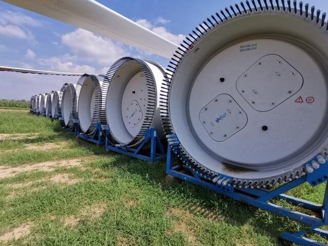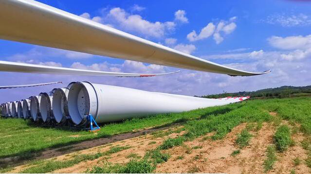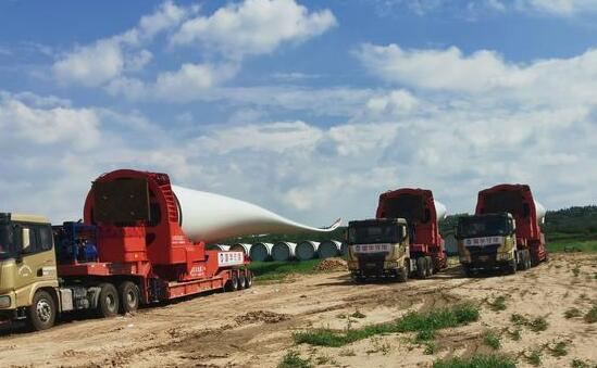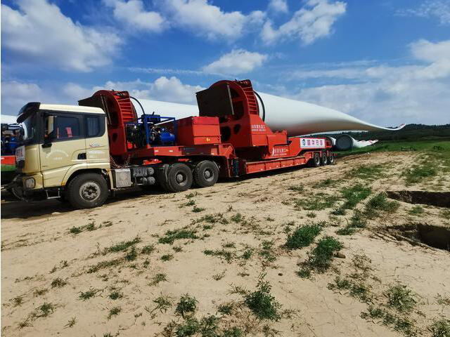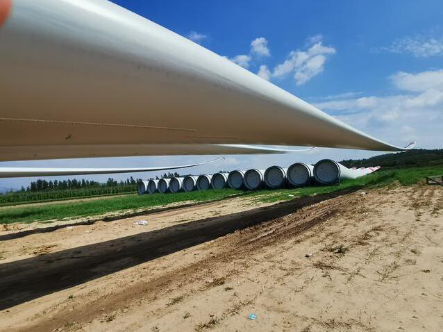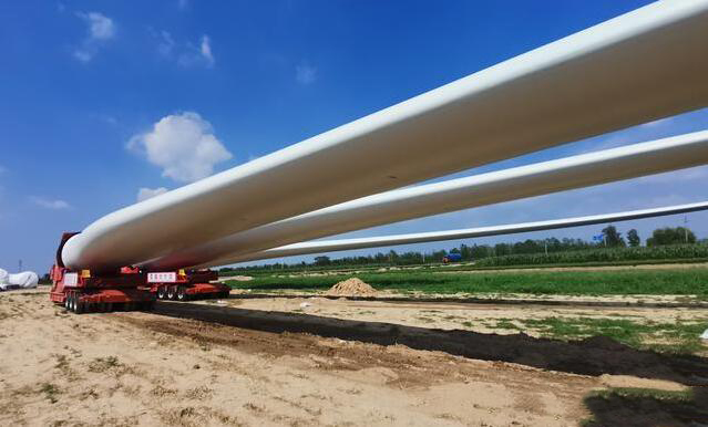 這些卡車上拉著的很大、很長、像飛機(jī)翅膀一樣的龐然大物就是風(fēng)力發(fā)電機(jī)的葉輪,就是我們所說的葉片。總長度60多米,二十多噸重。